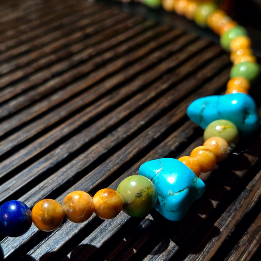Packed with high vibrations One Of A Kind Necklace with Kingman Coral Turquoise and Lapis Lazuli. Coppet and Sterling Silver lobster claw. Walk in Beauty